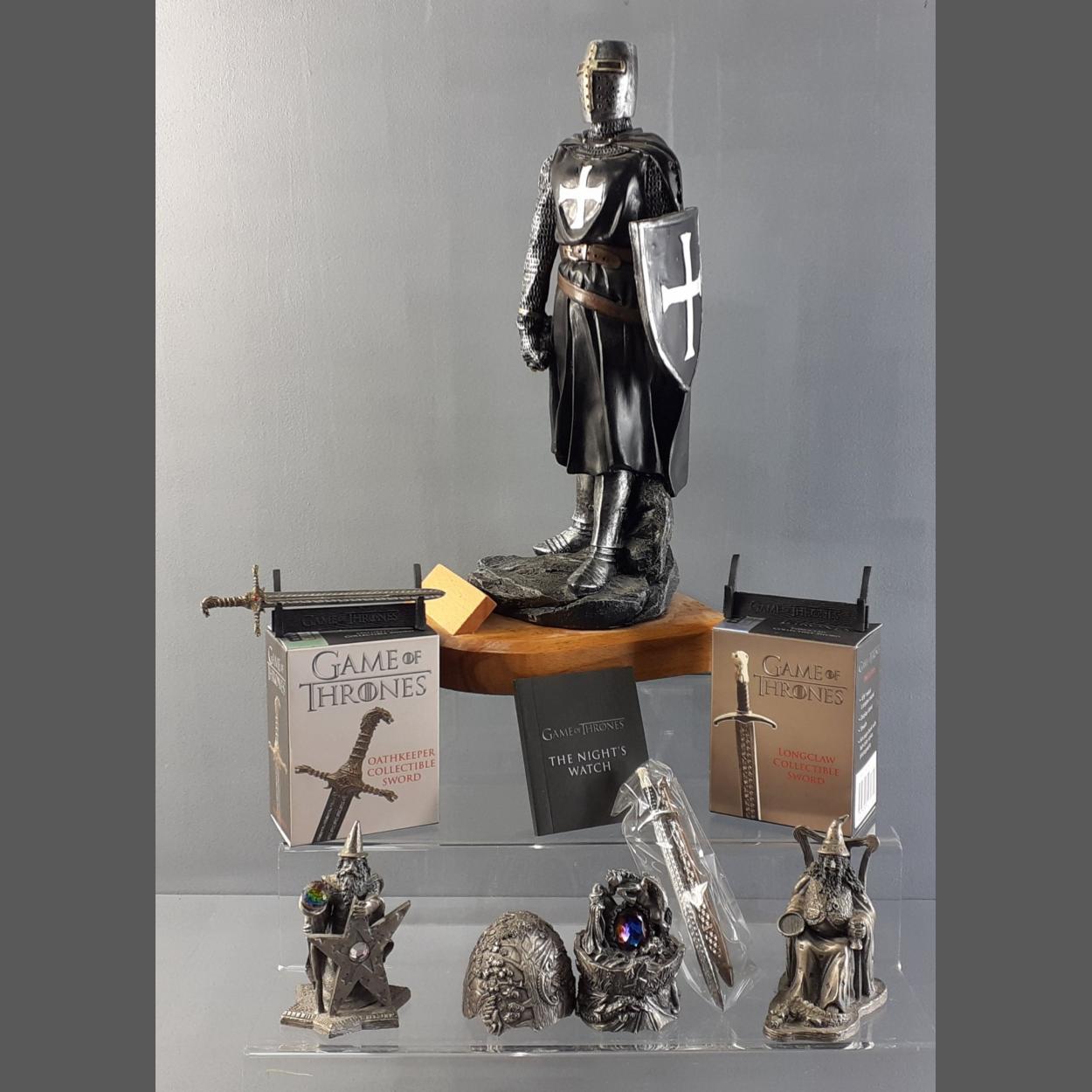 Fantasy / GAME OF THRONES lot comprising Black Knight on stand 33cm tall approx. Three metal WIZARD collectibles and two Game of Thrones Swords.