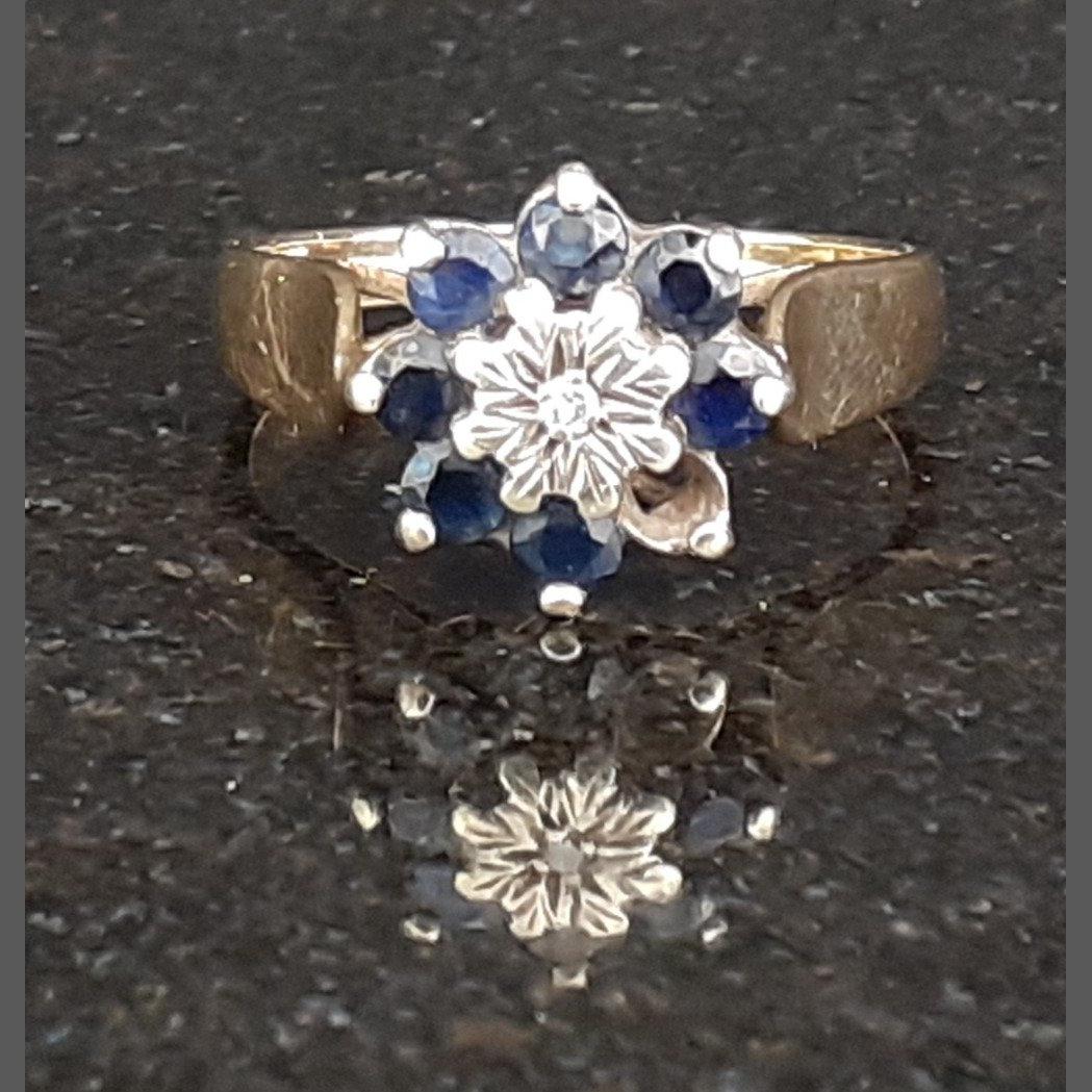 A hallmarked 9ct gold single diamond (tested) and sapphire cluster. Size Q, gross weight 3.34g approx. NB one sapphire missing