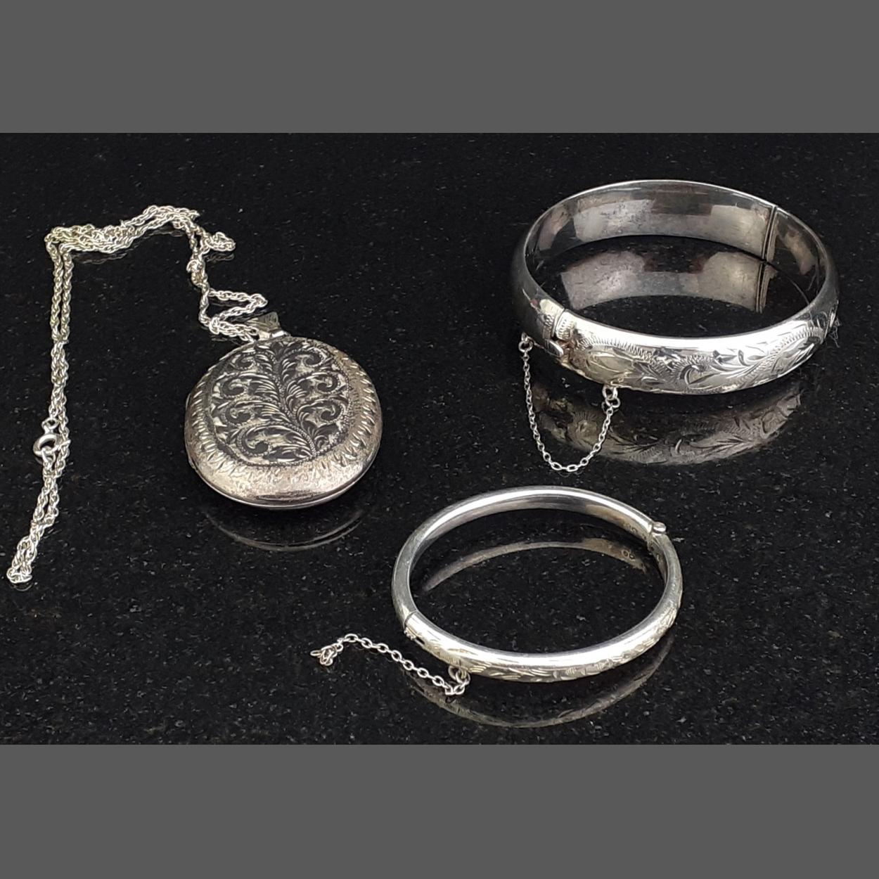 Three pieces of silver to include a large locket hallmarked Birmingham (5cm approx), a bangle with safety chain stamped Sterling and a hallmarked baby bangle. Total gross weight 43.75g approx