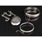 Three pieces of silver to include a large locket hallmarked Birmingham (5cm approx), a bangle with safety chain stamped Sterling and a hallmarked baby bangle. Total gross weight 43.75g approx