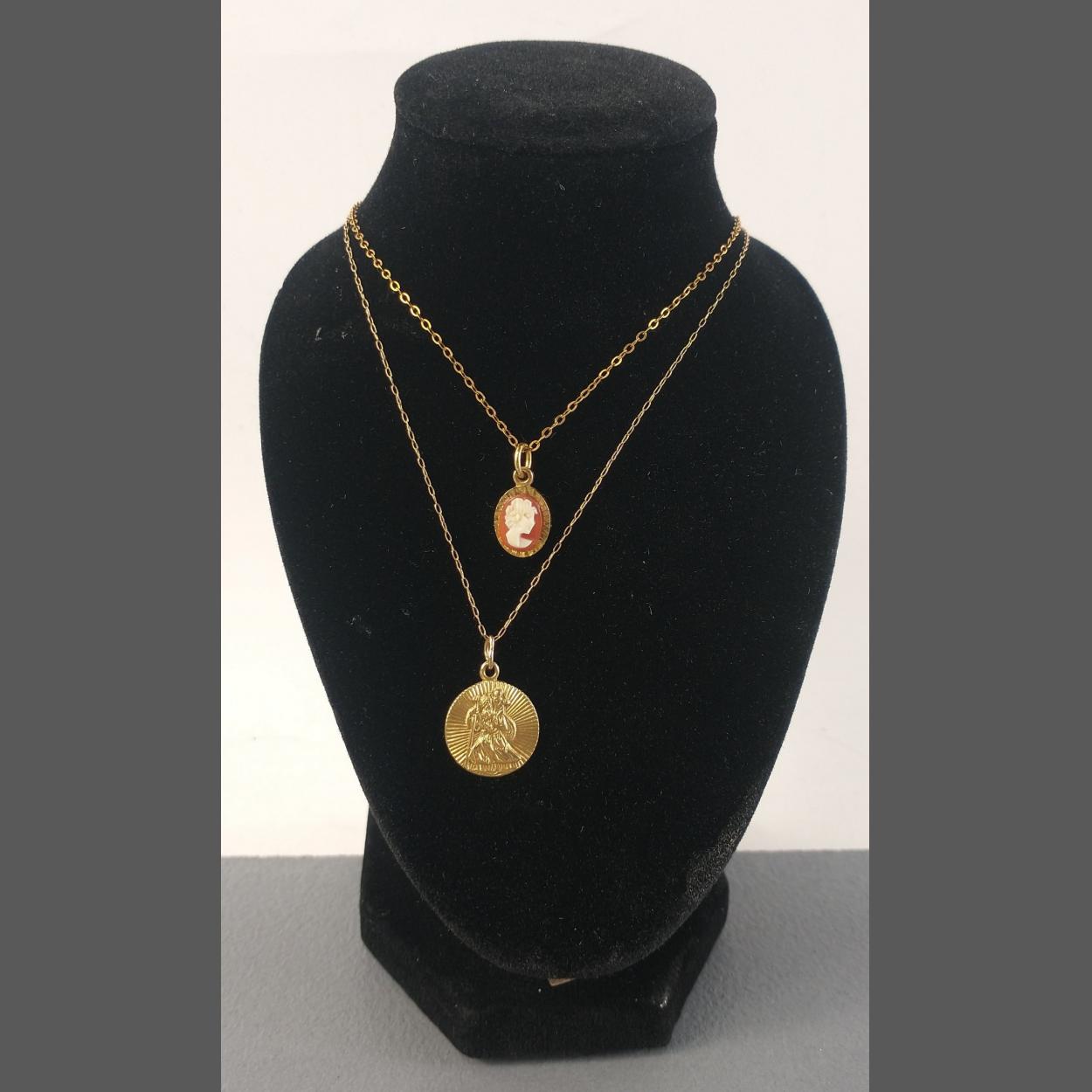 Two pendants and chains, St Christopher charm and cameo both stamped 9ct. Gross weight 3.9g approx