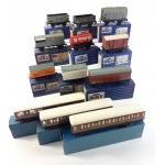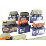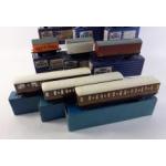 HORNBY DUBLO. A collection of twelve boxed rolling stock pieces to include Wagons, Corridor Coaches, Refrigerator Van and much else. All boxed but used from a large layout.