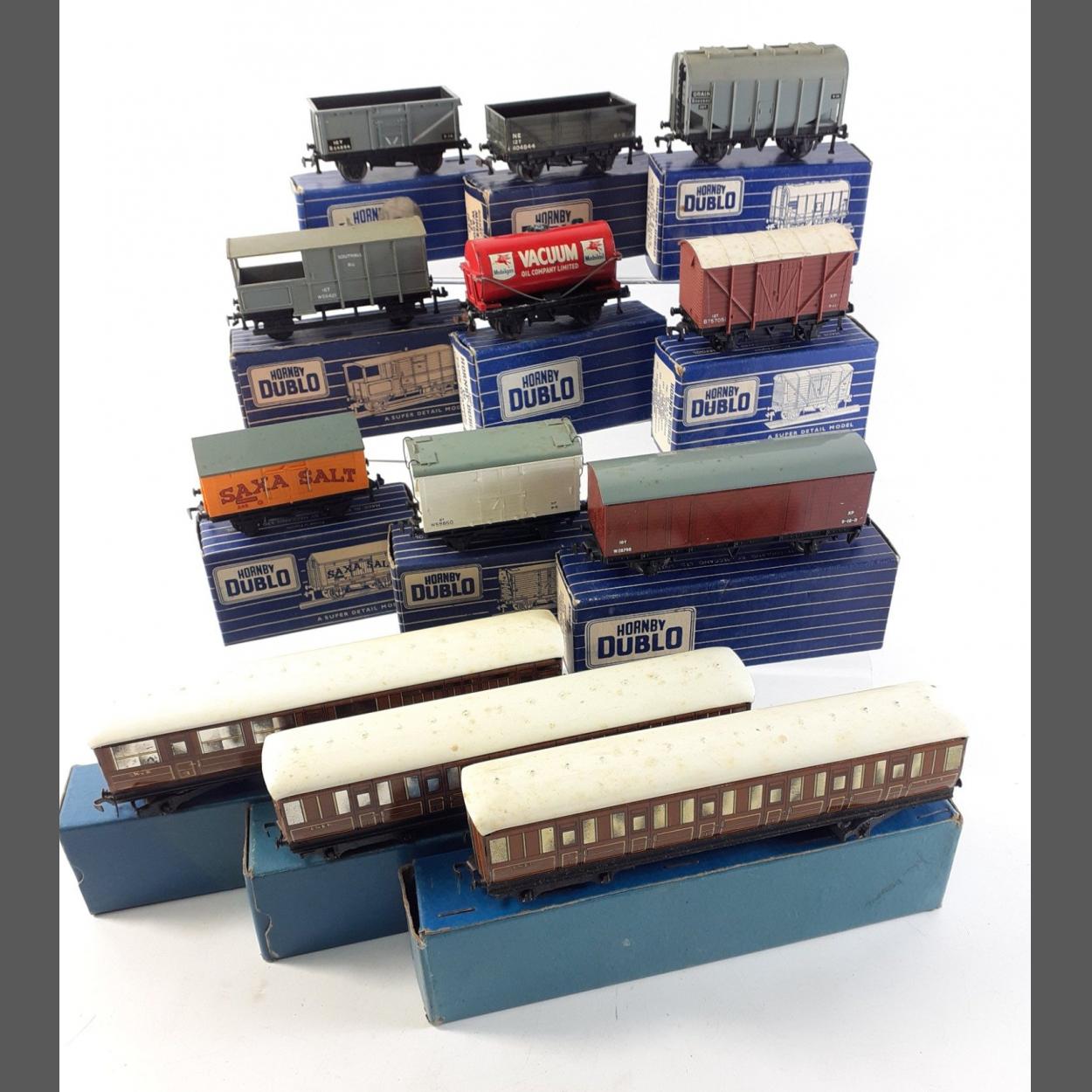 HORNBY DUBLO. A collection of twelve boxed rolling stock pieces to include Wagons, Corridor Coaches, Refrigerator Van and much else. All boxed but used from a large layout.