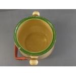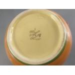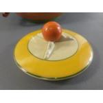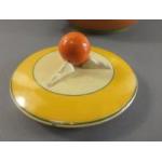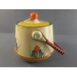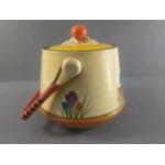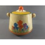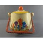 CLARICE CLIFF Bizarre Range CROCUS pattern biscuit barrel and cover, ovoid with rattan carrying handle, 18cm x 15cm high. Very minor historical chip noted to lid, minor rubbing but overall good condition.