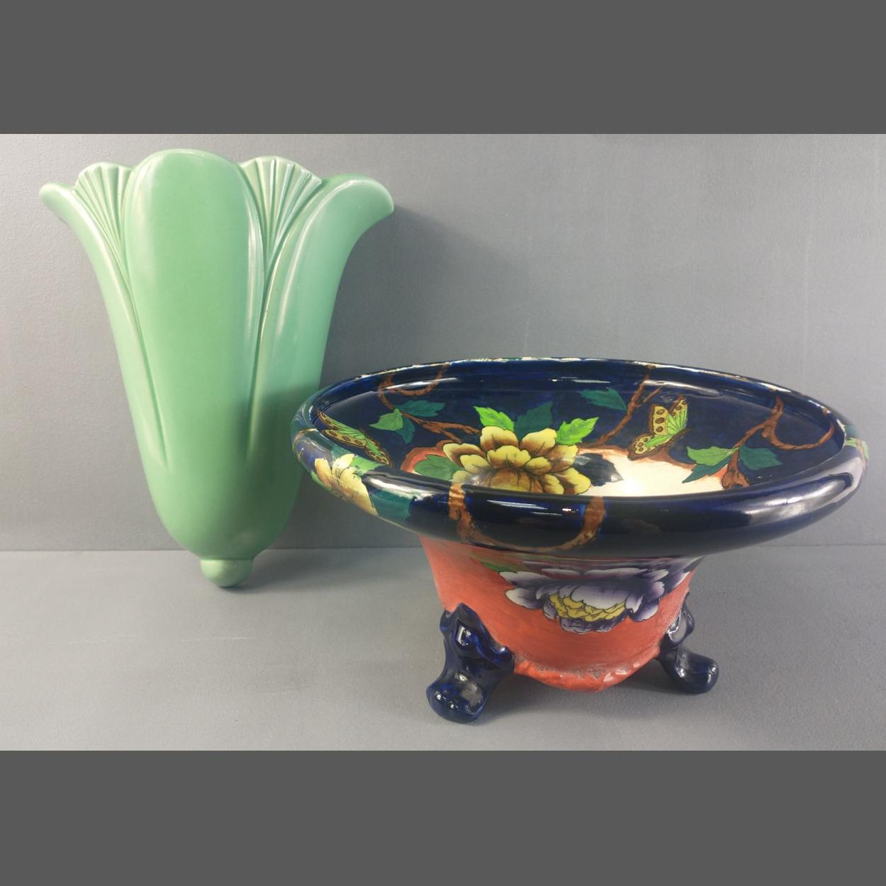 A DARTMOUTH wall pocket vase approx 20cm long and a MALING peona flower vase. Highly decorative.