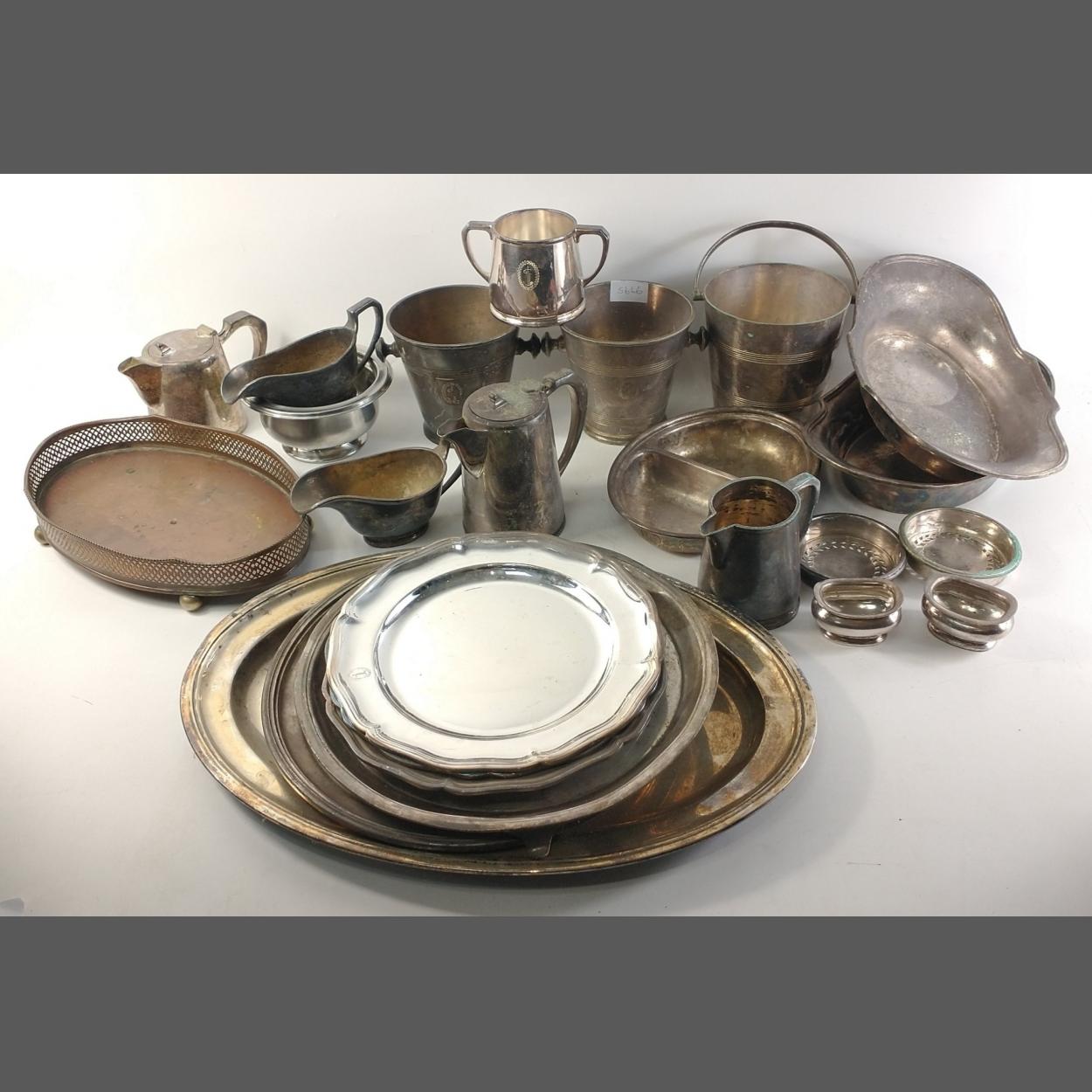 A large quantity of ex-shipping line silver plated serving ware, nearly all by MAPPIN & WEBB. Includes three wine buckets retaining their original ice drainage inserts.