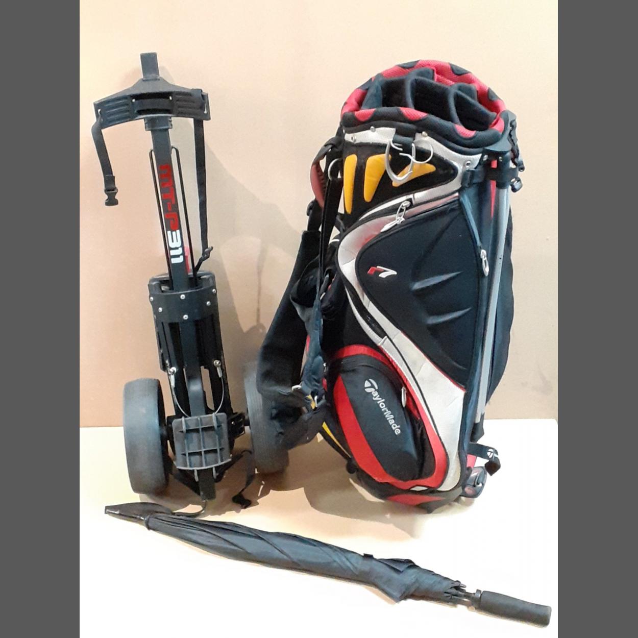 FOUR! - A TAYLORMADE R7 golf bag with golfing umbrella and golf balls included and a Masters golf trolley