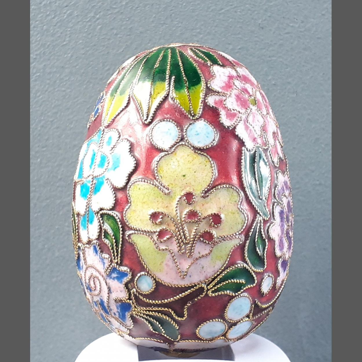 BEAUTIFUL CLOISONNE enamel egg in floral design - dimensions 8cm tall x 6cm diameter at the widest point approx
