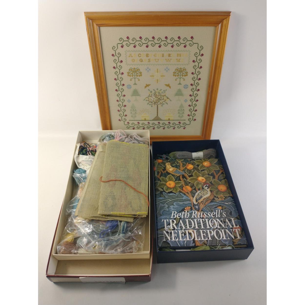 BETH RUSSELL'S Traditional Needlepoint book in gift pack with Appleton's wools plus additional box with selection of embroidery wools and a modern framed sampler
