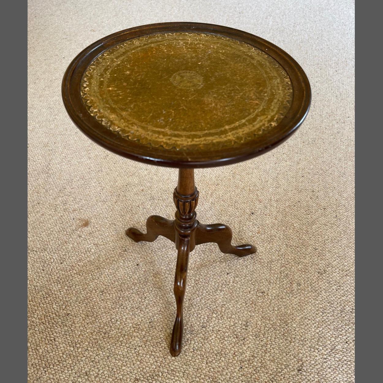 A nice wee WINE side table with faux leather top on tripod leg supports - diameter 1ft approx