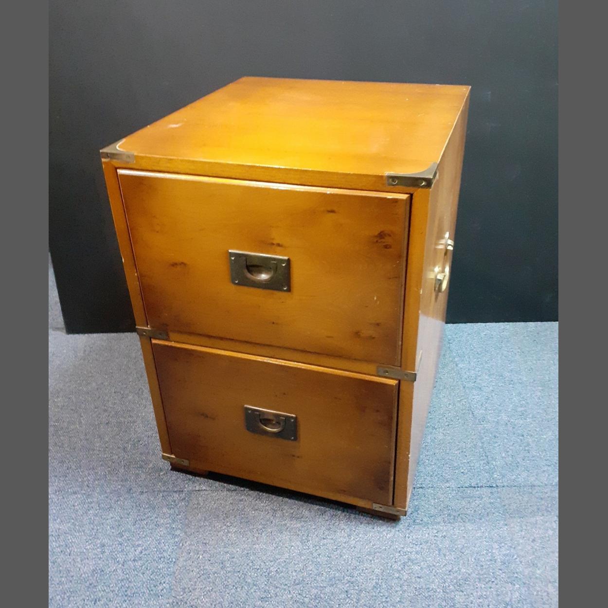 Campaign style two drawer side table with brass side handles and brass recesses handles to drawers. stylish and useful. Size 55cm x 46cm x 41cm