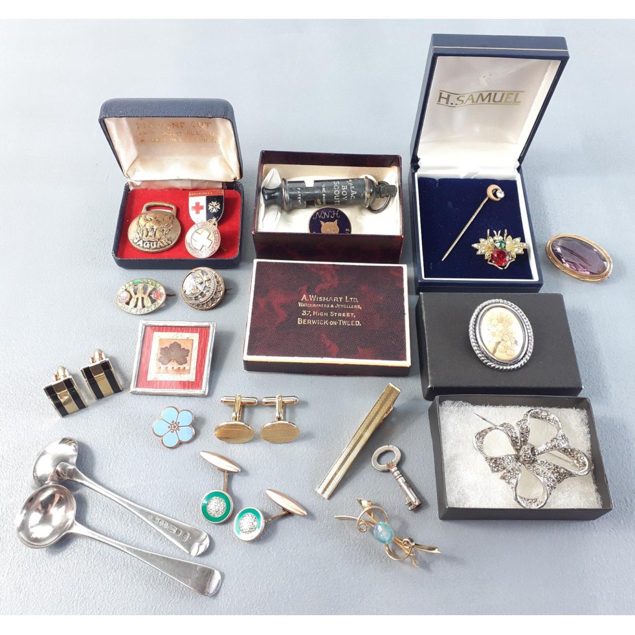 A mixed lot to include a marcasite brooch, Boy Scout whistle, cuff links etc