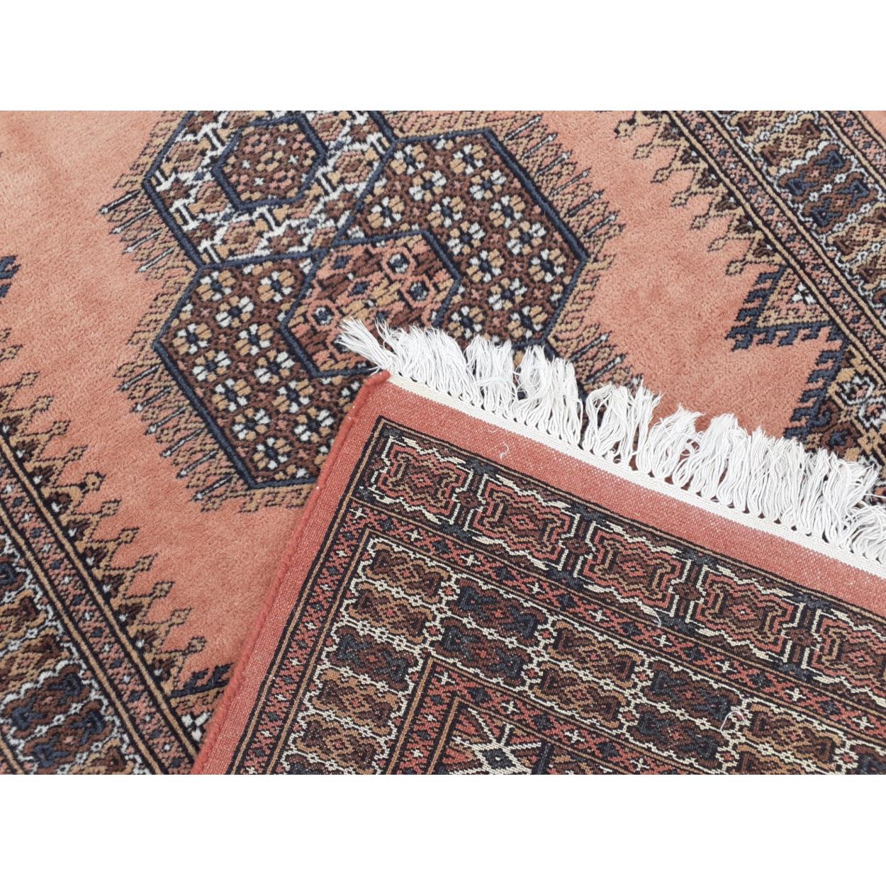 A woolen salmon pink rug with a geometric pattern approx 167 x 94cm