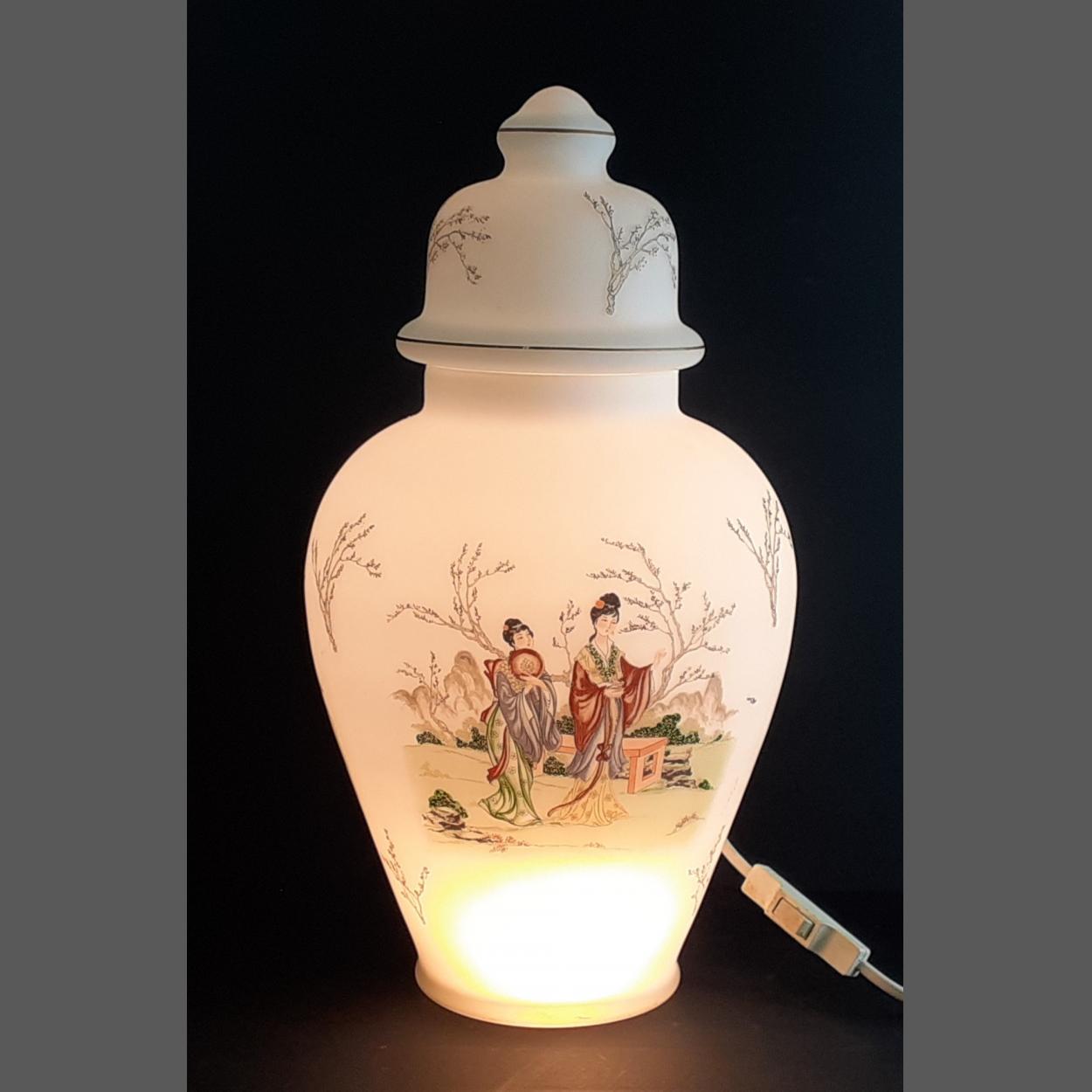 Attractive large oriental glass table lamp with cover and Japanese scene design. Stands 40cm approx.