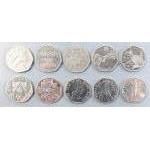 Small collection of 10 x 50p pieces. Consisting of Charles III 2023 Coronation, Charles III Shield, Elizabeth II 2016 1066, Elizabeth II 2017 Benjamin Bunny, 2019 Paddington, 2020 Diversity, 2017 Peter Rabbit, 2006 VC, 2011 Shooting, 2006 VC. All circulated