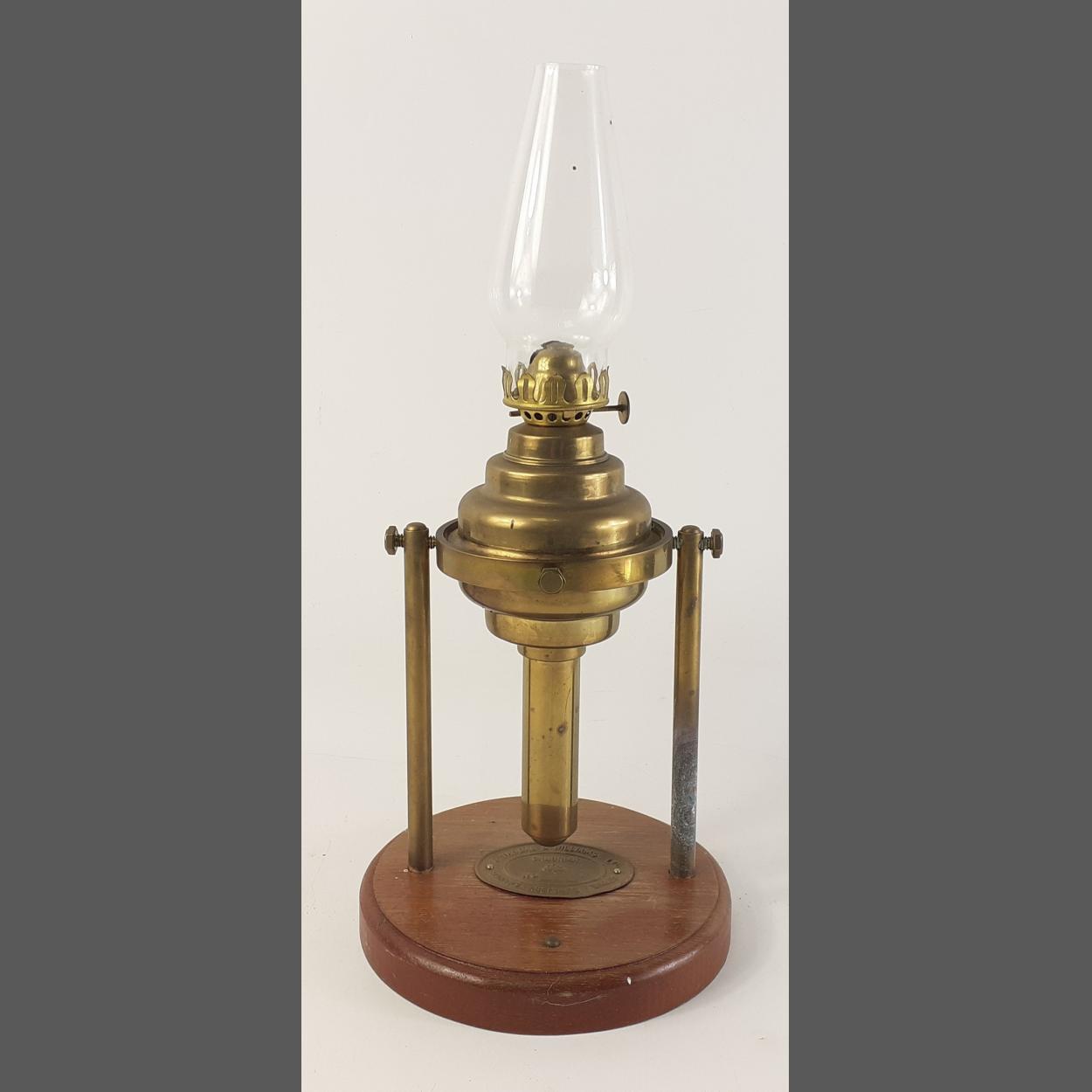 A THOMAS & WILLIAMS numbered Cambrian oil lamp on a gimbal. Height 37cm approx on wooden base