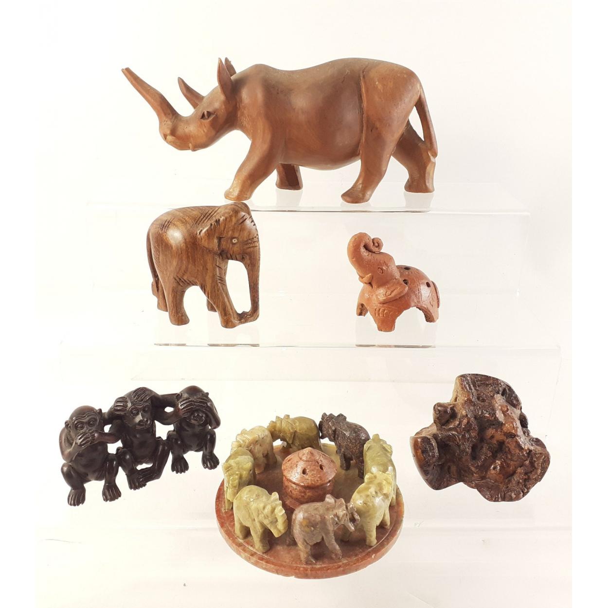 A small collection of animals to include a group of soapstone elephants, a terracotta elephant, a wooden elephant, three wise monkeys, and a wooden rhino 20cm long approx (tiny chip from end of horn).