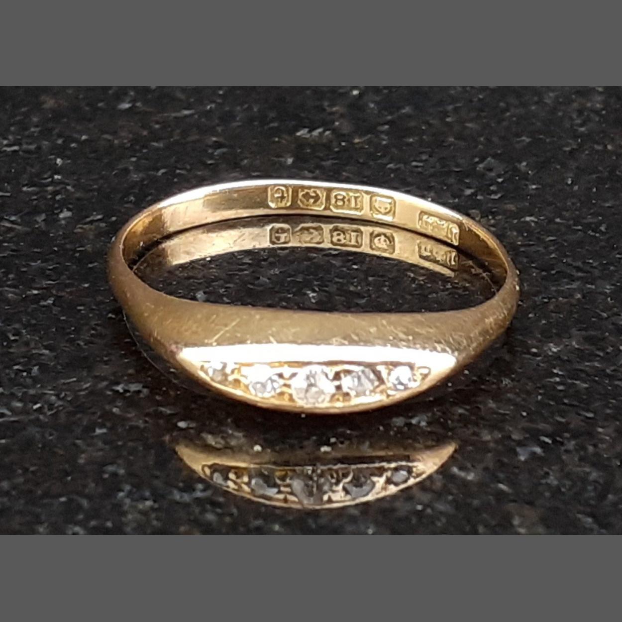 A fully hallmarked 18ct ring set with 4 diamonds (tested). Size O, gross weight 2.50g approx