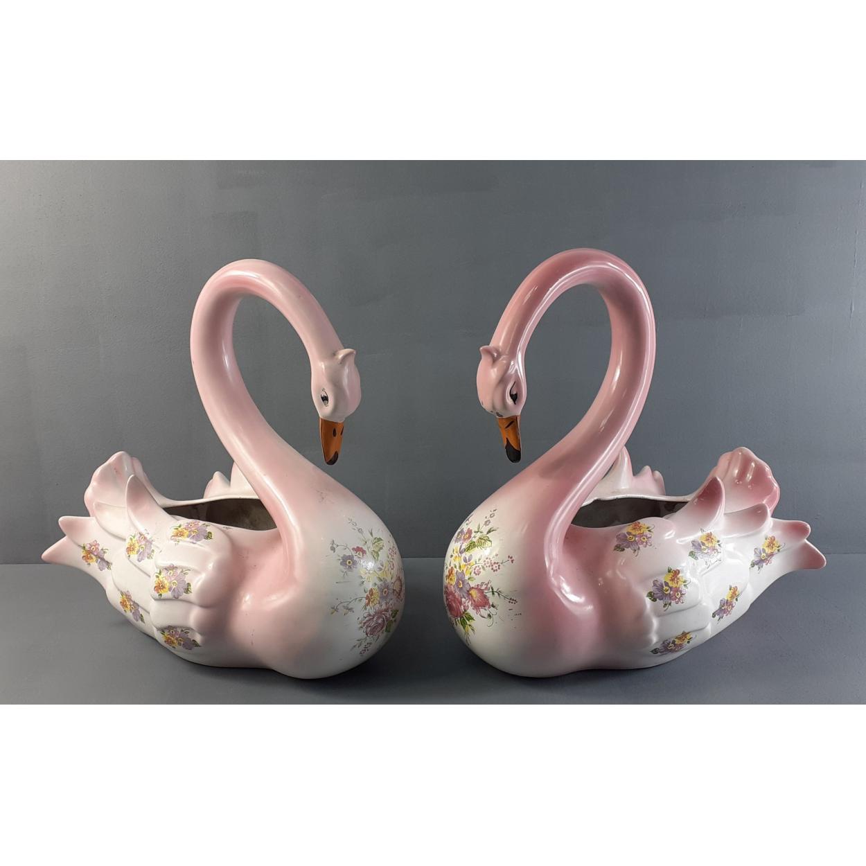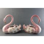 DECORATIVE! Two vintage graceful pink swan flower containers standing 30cm tall, 28cm wide approx