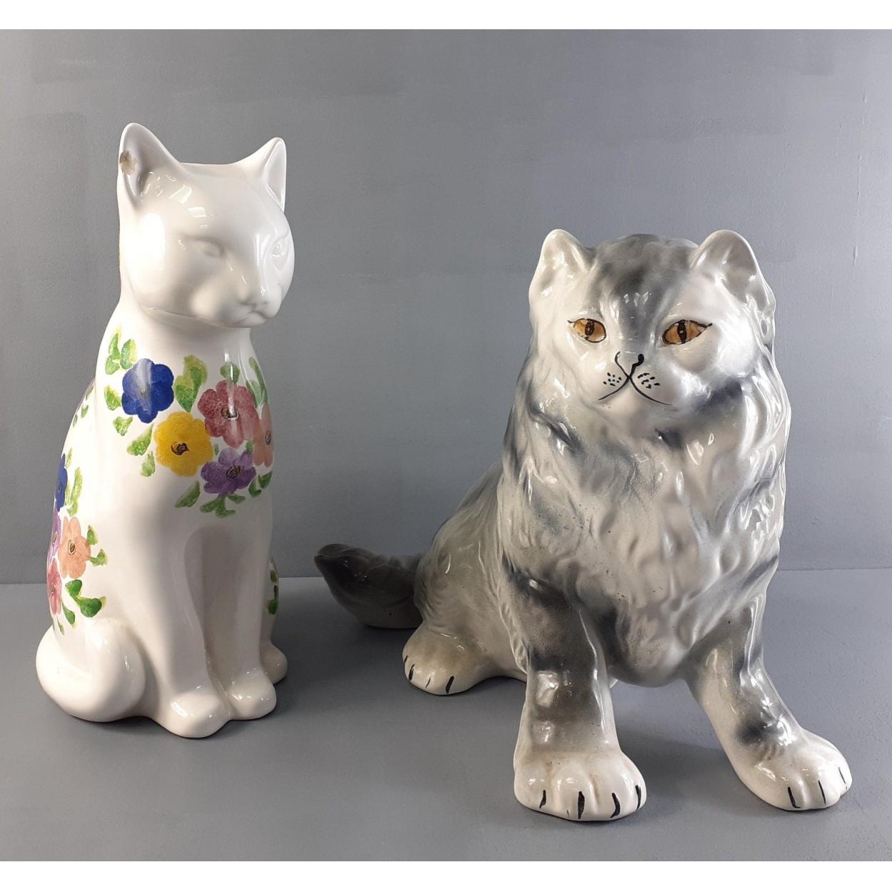 Two decorative cats one hand-painted for Redusta, 30cm tall (chip to one ear) and the other a long-haired cat 26cm tall approx