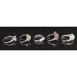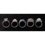Collection of five 925 stamped rings. Styles include pale purple solitaire size S, jade coloured central stone with peridot side stones size P/Q, floral cluster with deep red stone size Q, mystic style oval stone surrounded by orange stone, deep blue central stone with dual white stone shoulders. Weight: 21.8g approx