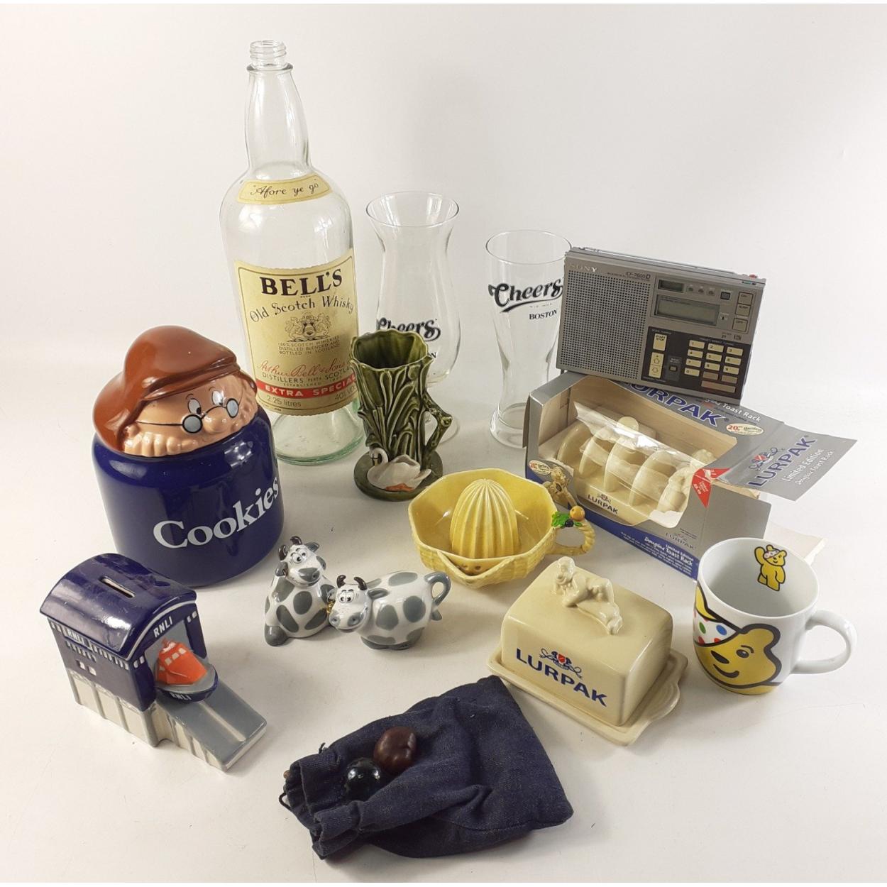 A good collection of advertising themed items. Lurpak toast rack and butter dish, Tetley Cookie Jr, Sylvac and Carlton ware items, Money bottle etc. =