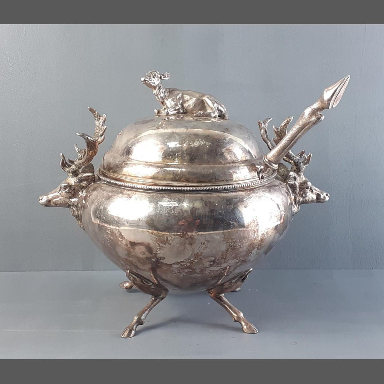 Stunning silver plated Game Soup tureen with superbly sculpted deer finial and stag head handles and deer leg feet. Comes with a deer foot ladle. Surprisingly no makers mark but clearly a maker of some ability. Stands 26cm tall and measures 28cm across at the handles.