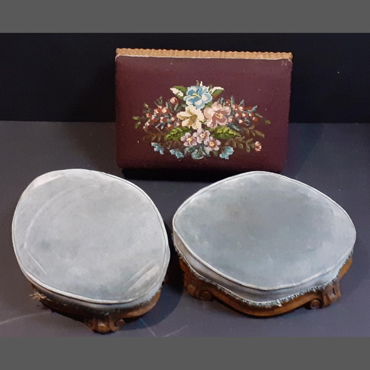 Three antique footstools, comprising two matched scrolled carved matching ones and one other with embroidered cover.