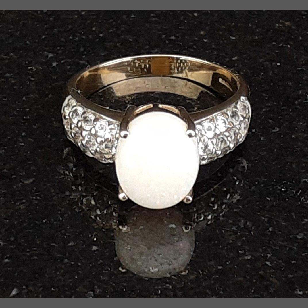 A 375 stamped ring with central opal (10mm approx) and clear stones on the shoulders. Size Q, gross weight 4.05g approx