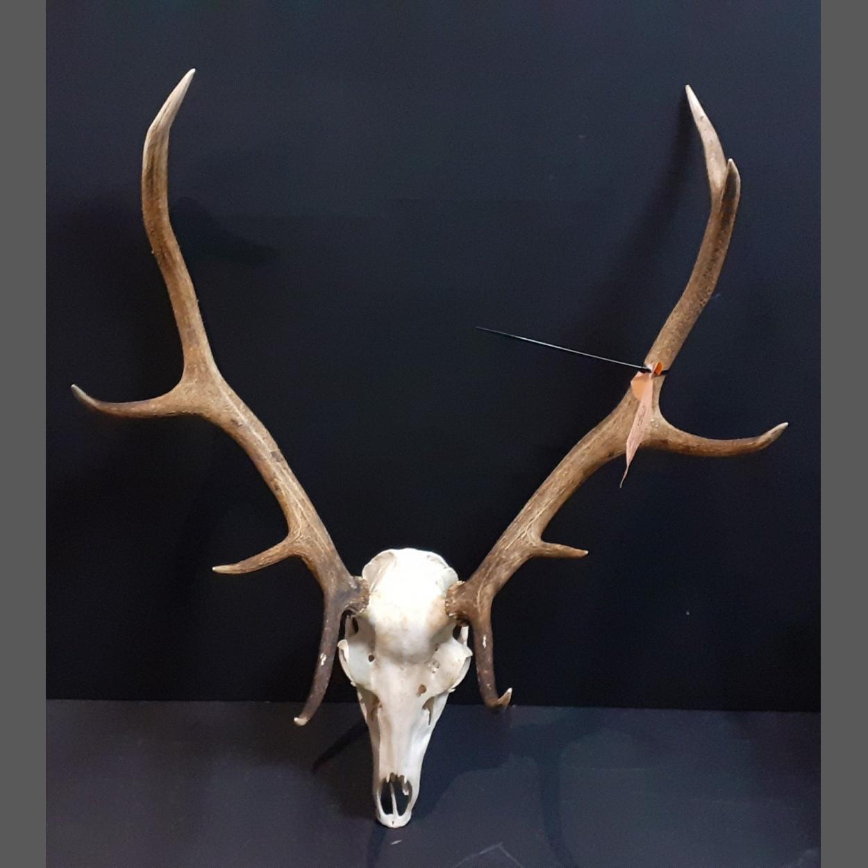 Stags head skull and antlers mounted on plaque. Nine point antlers.