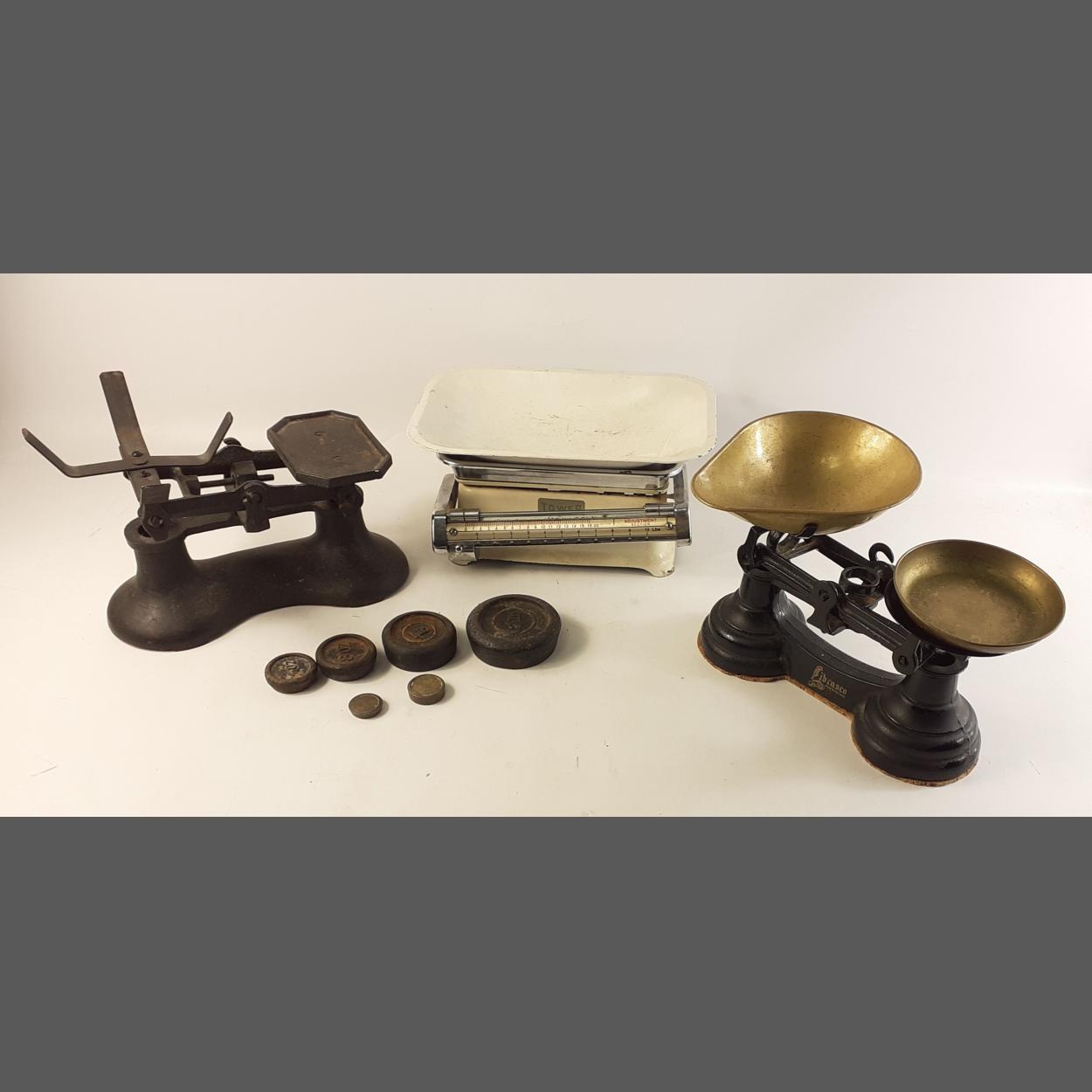 A box containing three sets of scales with some weights. Two pan sets and one top loader.