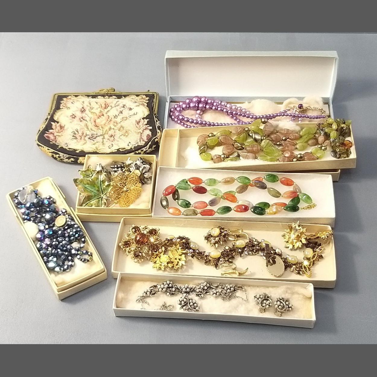 A selection of vintage and modern jewellery to include very attractive necklaces and earrings, beads, polished stone necklace, gilt pieces. LOADS OF BLING!