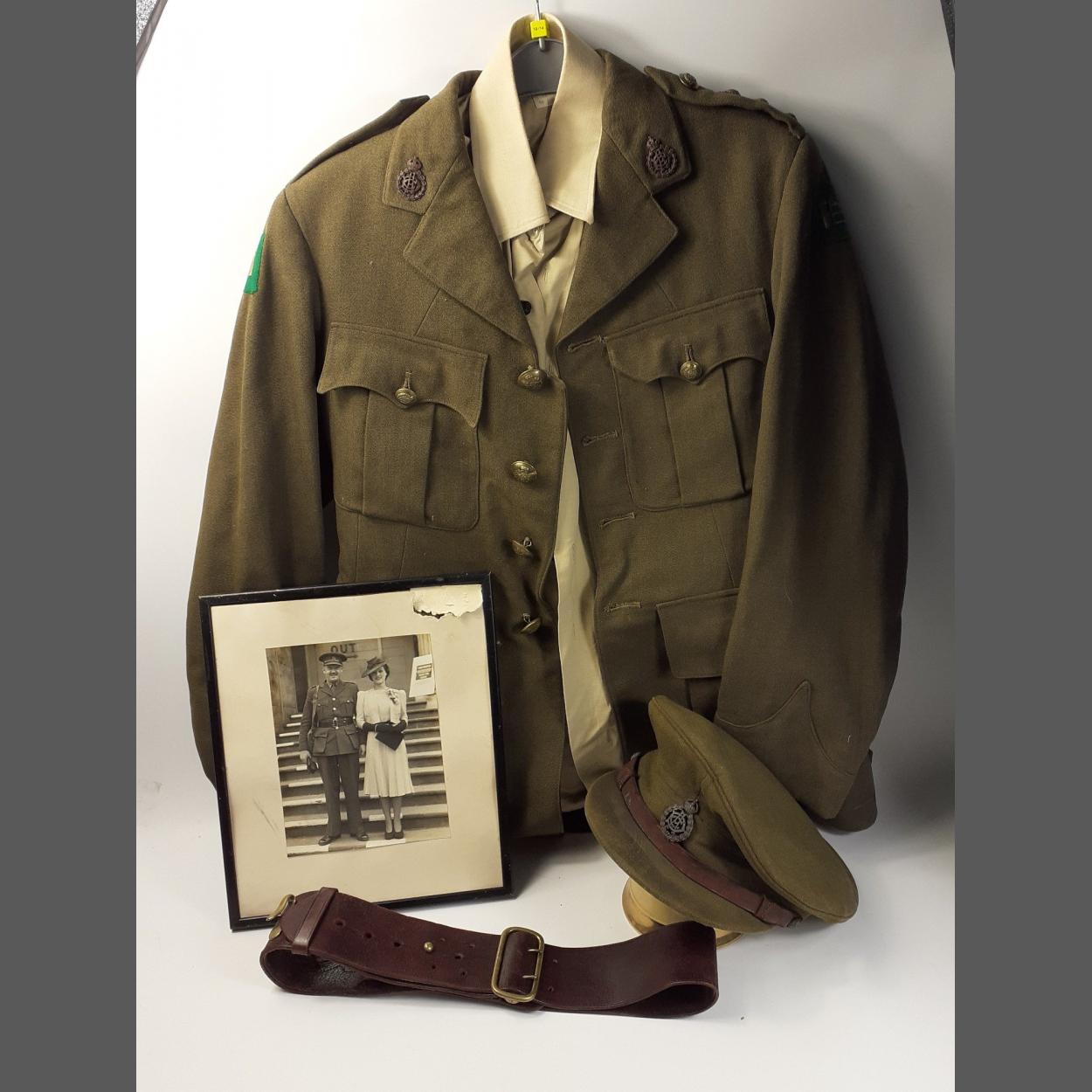 WWII Captain. Full Uniform with interesting Northern Ireland shoulder patches. Badges indicate Army Dental Corps. Includes Cap, Jacket, Trousers, shirt (possibly later in date), Belt and contemporary photo of the good Captain with his wife. All in good used order.
