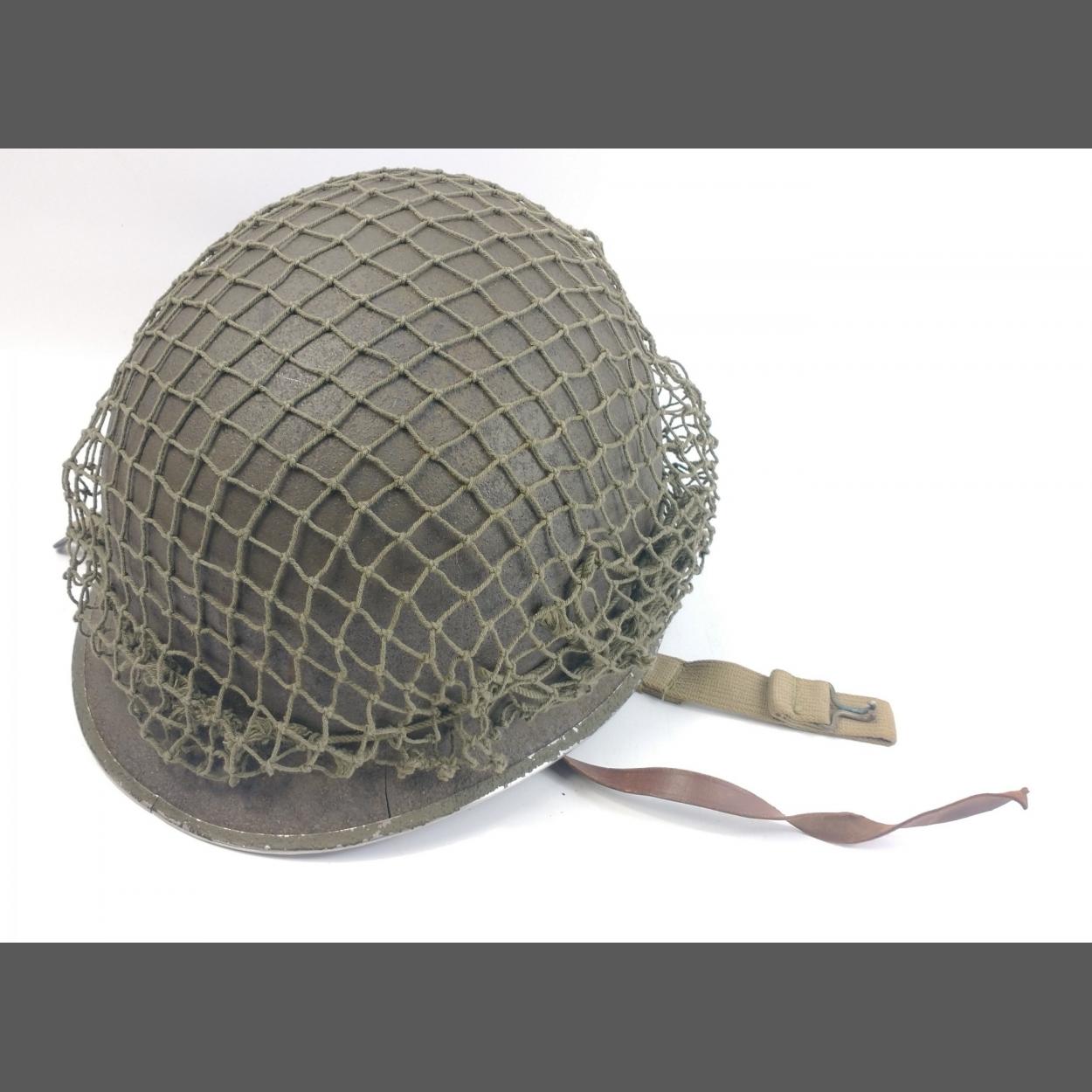 WWII United States US M1 helmet with Red Cross decals. Intact chin strap and liner.