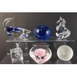 A collection of 6 glass paperweights to include an apple (glass stem broken), a golf ball, an interesting cube shaped one with a dragon within it - quite unusual! 3.5cm faced approx