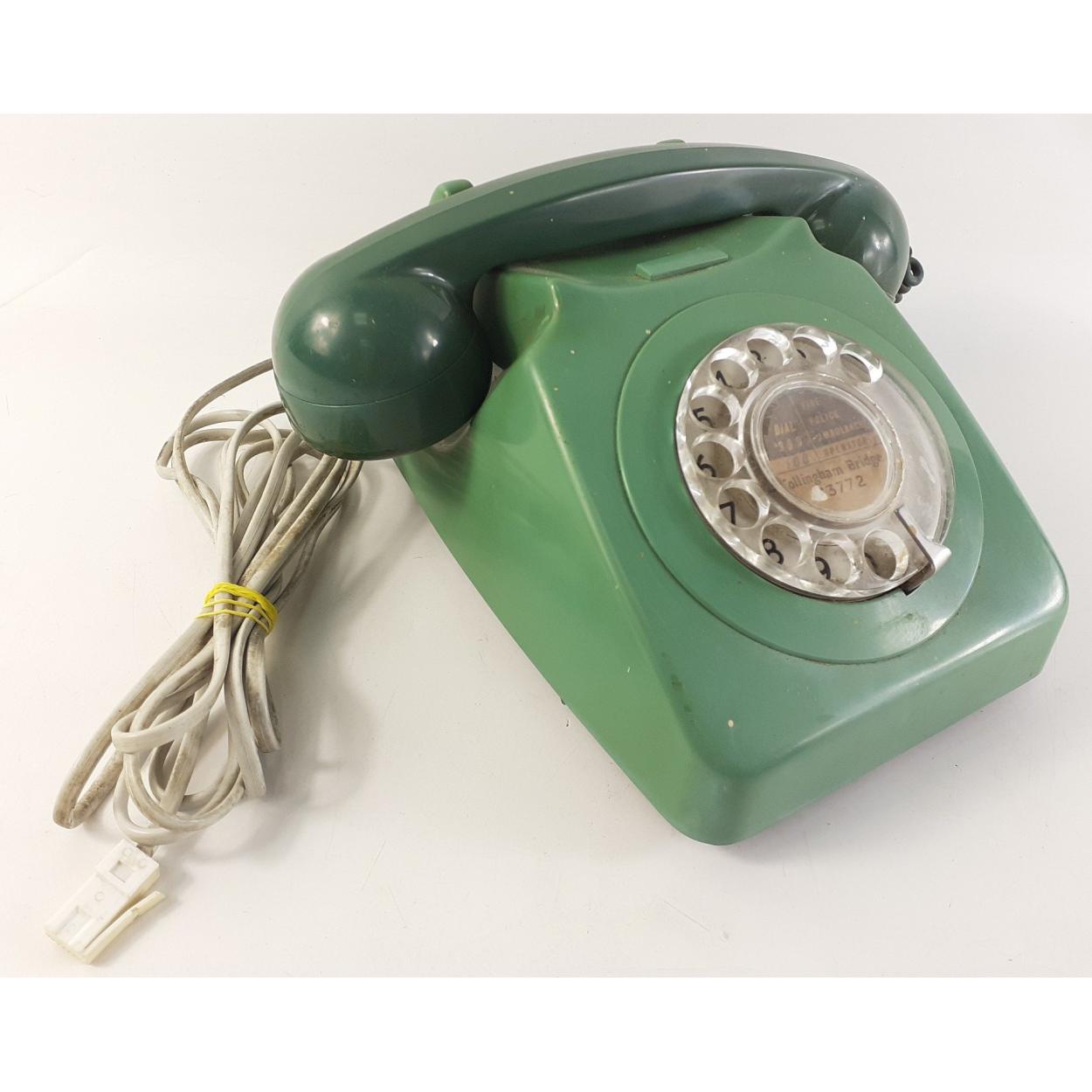 An olive green retro rotary dial telephone