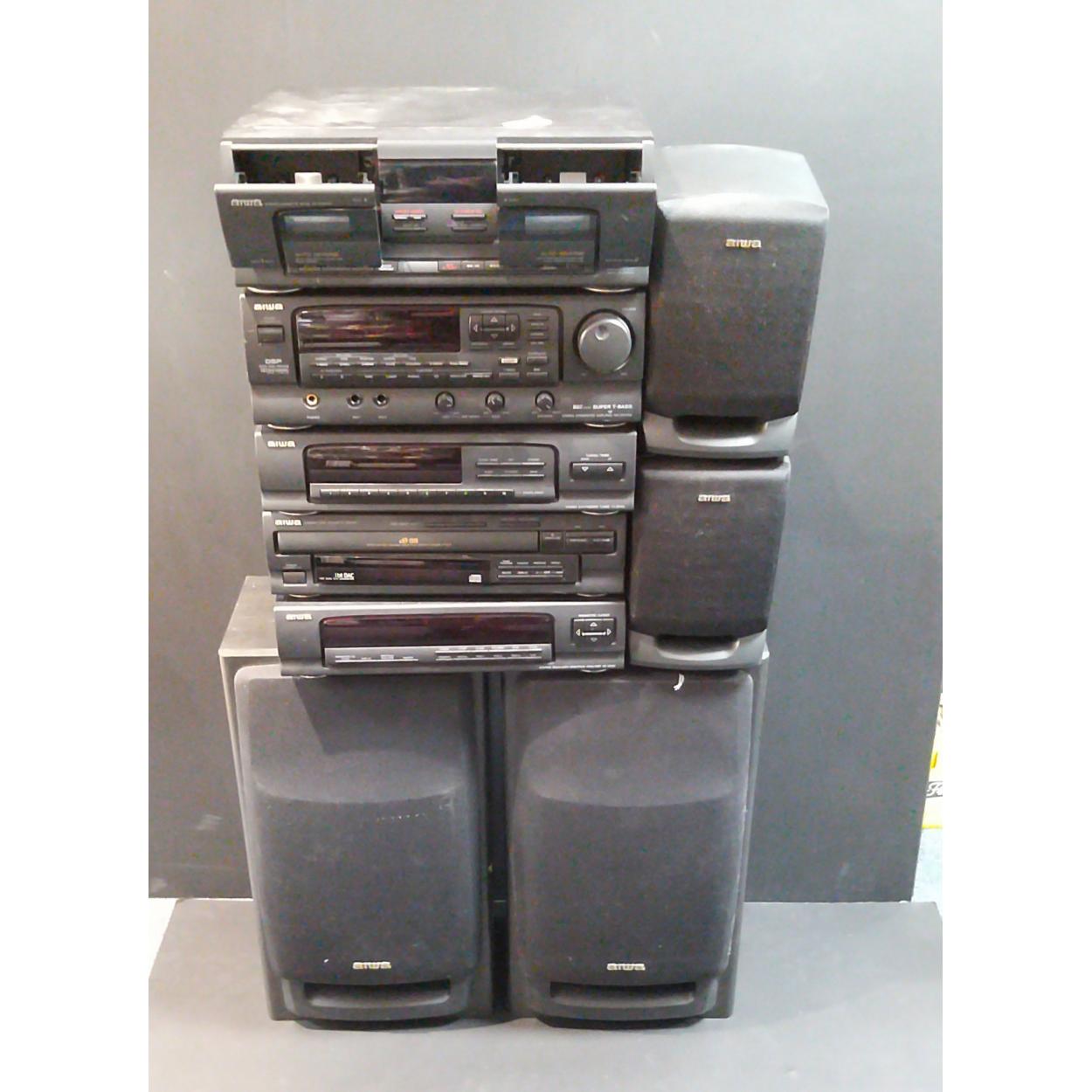 AIWA stacking system with amp, turntable, radio, 3 disc CD PLAYER and tapedeck with two large and two smaller speaker system