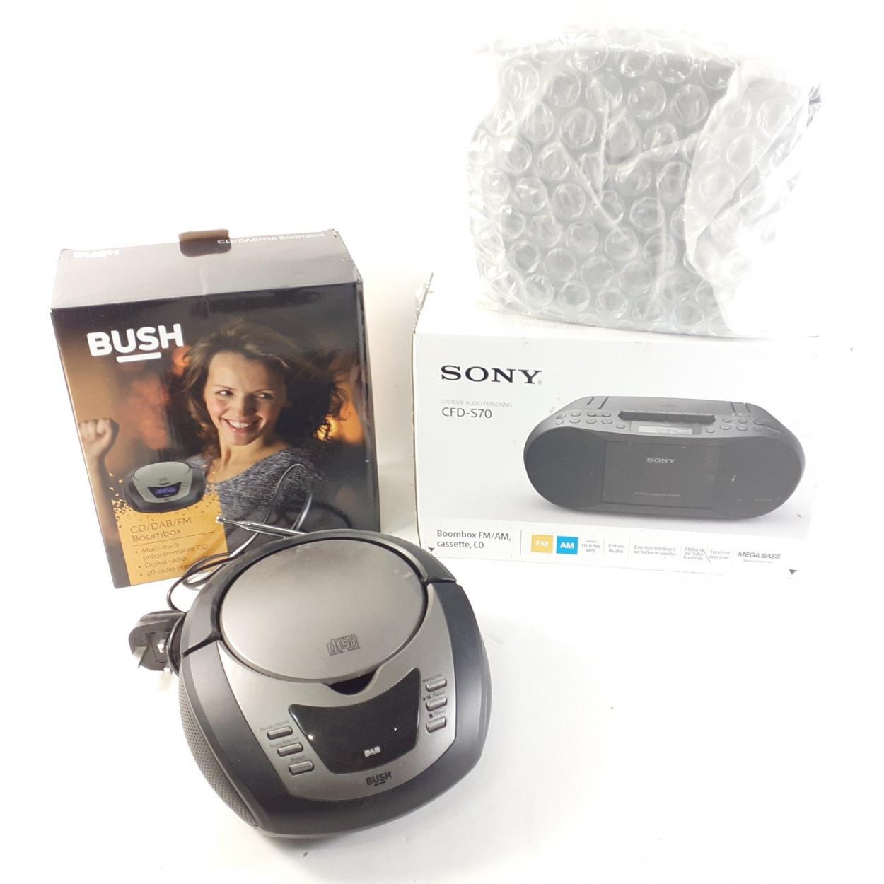Two CD FM radios in boxes. One SONY and one BUSH.