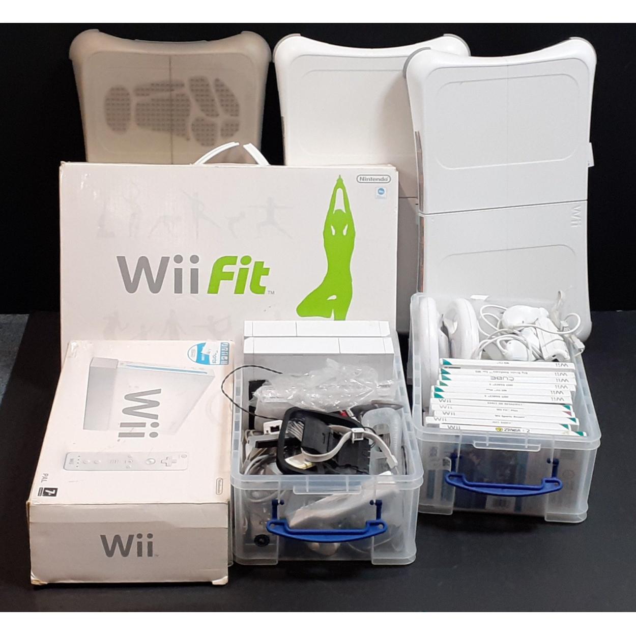 NINTENDO Wii lot comprising three consoles, four Fit Boards, controllers and various games.