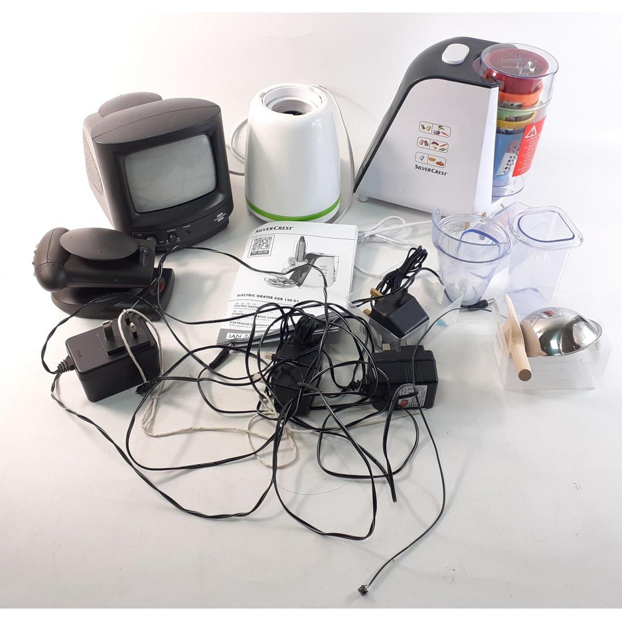 A mixed electronic lot incorporating CCTV with monitor, Silvercrest electric grater and others.