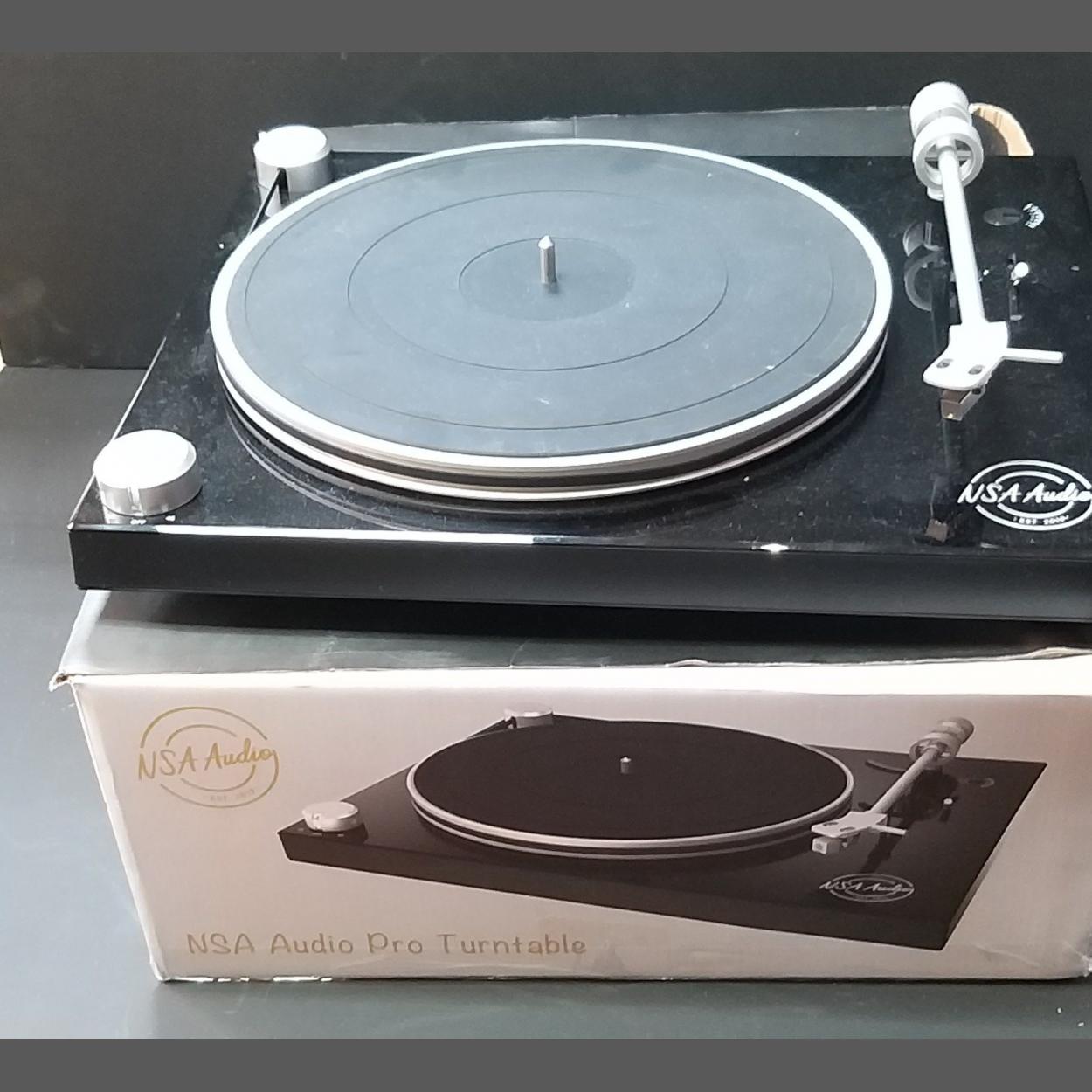 NSA AUDIO TURNTABLE Pro with USB recording etc with a mixture of cables to include a power cable etc still in its box - dimensions 44cm x 36cm approx