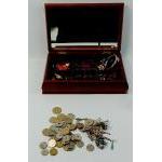 A wooden jewellery box with padded fabric lid and mirrored interior (28x18x8cm approx)with contents to include 925 stamped jewellery (gross weight 52.5g approx), costume jewellery, obsolete European coins etc
