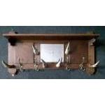 A striking wooden wall-mounted coat rack with 4 brass hooks and 6 shed horns, mirror to centre and shelf to top 100cm wide approx