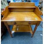 ANTIQUE - An attractive quality EDWARDIAN gloss-finish writing table with raised back with shelf, lower shelf and full width drawer with 2 knob handles. Measures 82x100x53cm approx