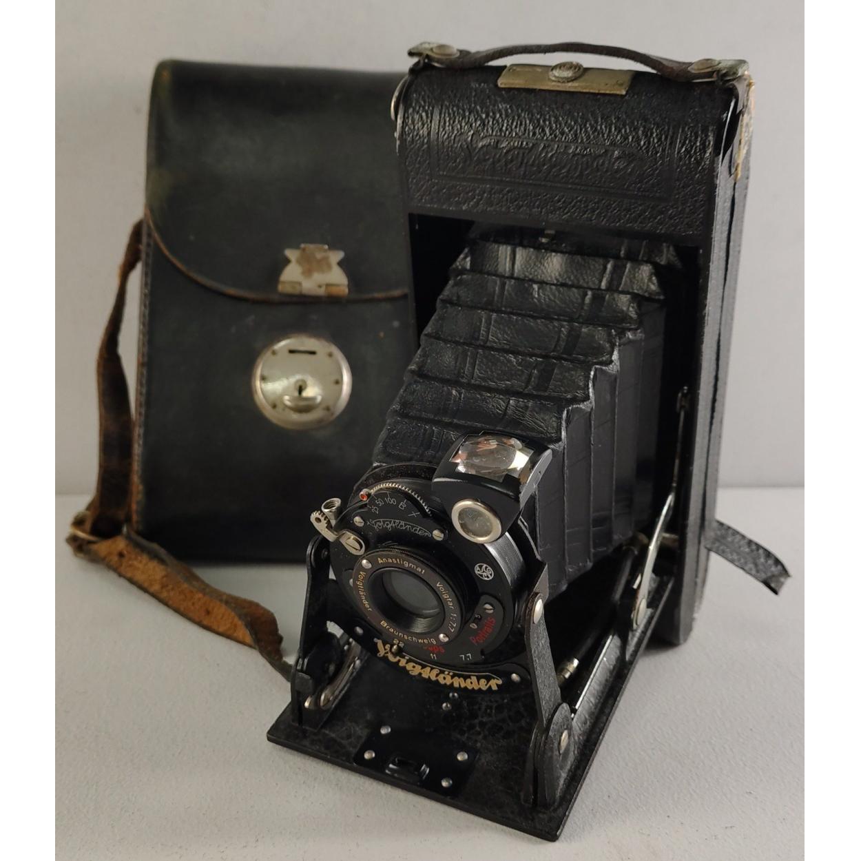 A vintage VOIGTLANDER ANASTIGMAT VOIGTAR 1:7.7 folding camera, bellows in good order. Case with wear