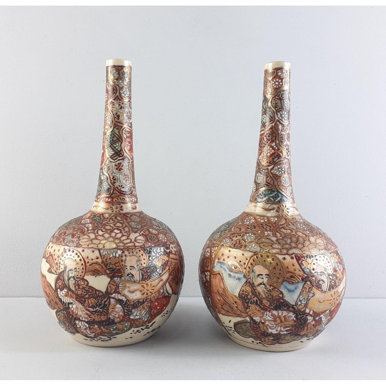 A pair of antique Japanese Satsuma bottle neck vases. Each 20cm tall approx. One noted with chips to the rim.