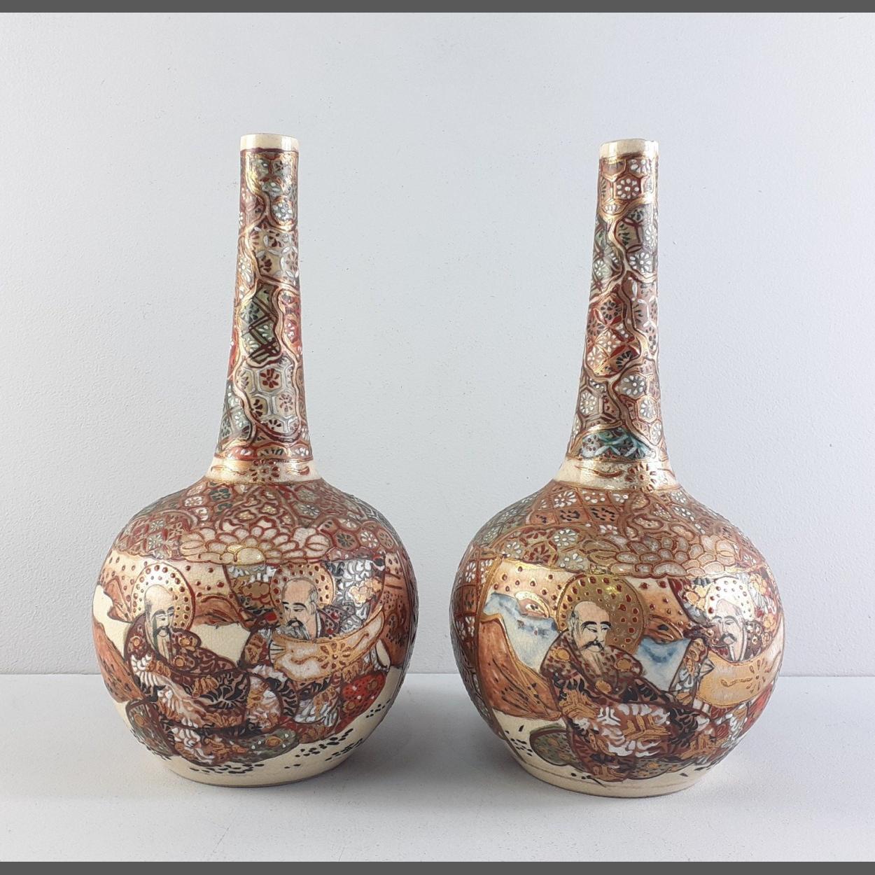 A pair of antique Japanese Satsuma bottle neck vases. Each 20cm tall approx. One noted with chips to the rim.