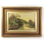 A lovely ornately framed picture of a family in a boat on a very peaceful river. Damage to the painting itself. Artist's initials C.M.T/94 Frame size 58 x 43cm, image size 39 x 25cm approx