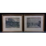 An interesting pair of golfing prints. THE GOLF STREAM by Tom Scott and PREHISTORIC GOLF ON THE BRAIDS. Each 34cm x 29cm approx.