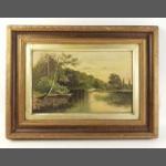 A lovely ornately framed picture of a family in a boat on a very peaceful river. Damage to the painting itself. Artist's initials C.M.T/94 Frame size 58 x 43cm, image size 39 x 25cm approx
